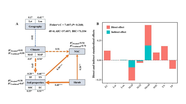 研究表明,齿肋赤藓总NSC及其各组分含量受灌丛效应、年降水和年均温的共同影响。灌丛的存在显著提高了齿肋赤藓果糖、淀粉和总NSC含量,降低了可溶性糖/淀粉。随着年均降水量的减少,齿肋赤藓总NSC、各组分含量以及可溶性糖/淀粉显著增加,两种微生境间(灌丛下和裸露地)的差异随着年均降水量的增加逐渐缩小,表明微生境的影响总体受气候(降水)变化的调控;而随着年均温的增加,两种微生境则表现出相反的结果。结构方程模型分析结果显示,气候和灌丛直接通过改善土壤养分间接影响了齿肋赤藓NSC含量。其中,灌丛的影响最为显著,其次是年均降水量,且随着年均降水量的减少灌丛效应逐渐增加。上述研究结果为理解不同微生境藓类植物抗逆性机制提供了新的见解。