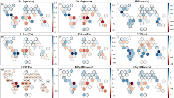 图1 全球46个子区域中,极端降水指数的变化趋势