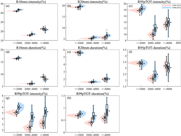图2 在两个参考期,不同高海拔带的极端降水指数占比情况