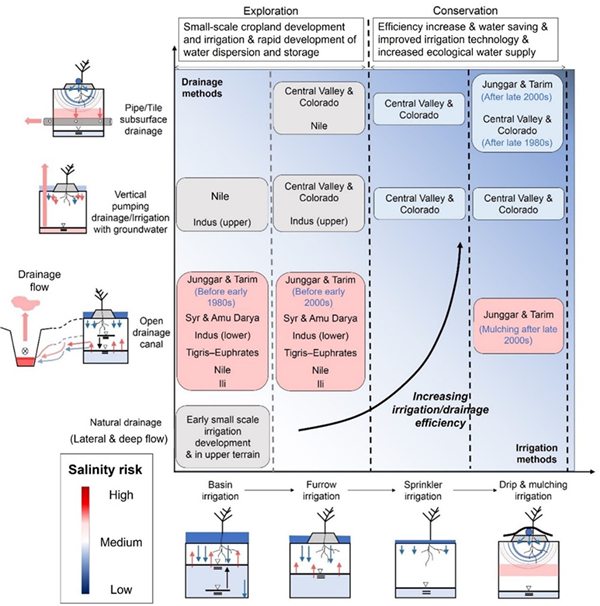 在干旱区,不合理的灌溉和水管理可能引起耕地的土壤盐渍化。因此,通过优化水管理方式来减轻土壤盐渍化对实现土地退化中和等可持续发展目标十分重要。然而,由于方法学局限,耕地土壤盐渍化与水管理的大尺度信息严重匮乏,限制了我们理解水管理方式对盐渍化的影响及其驱动机制。