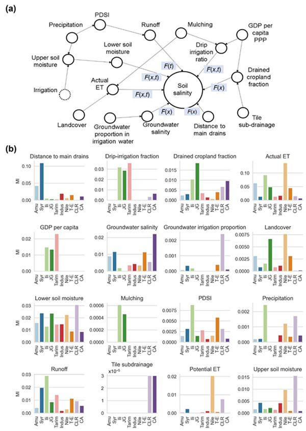 罗格平团队结合遥感数据、新疆和中亚等地的大量实地土壤采样以及世界土壤数据库中的土壤盐度数据等,通过Google Earth Engine和机器学习反演了1984-2021年全球干旱区耕地1公里分辨率的土壤盐度,提高了在样本匮乏区域的盐度估计精度(如中亚、中东等区域)。进一步地,通过结合所搜集的灌溉和排水方式变化数据、全球用水模型PCR-Globwb估计的灌溉用水量、地下水位变化等,厘清了不同流域水管理方式对盐渍化发展的影响。