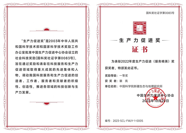 12月12日,在中国生产力促进中心协会举办的“第十六届生产力创新发展大会”上,科技部、中国科协、中国生产力促进中心协会领导出席,为来自全国各行业的41个集体和80名个人颁发了2023年度中国生产力促进奖获奖证书。乐发Ⅱ2国家荒漠-绿洲生态建设工程技术研究中心沙漠研究团队的裴亮研究员荣获一等奖(一等奖共15人)。