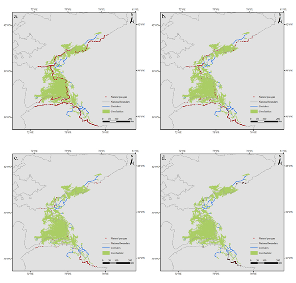 图1 四种情景下马可波罗盘羊的潜在自然通道