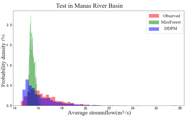 DDPM和MissForest在玛纳斯河流域模拟的概率密度函数