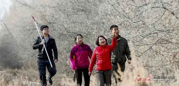 塔里木大学生命科学学院教授李志军(右二)在学校附近的实验林里,带学生查看胡杨的生长情况(摄于2018年12月14日)。石榴云/新疆日报记者谢龙摄