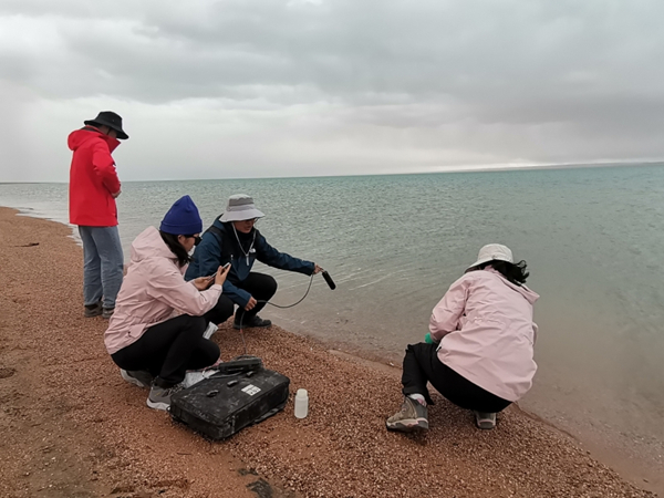 5月底,昆仑山北坡水资源科学考察队的科考人员在阿雅克库木湖边巡测。图片由昆仑山北坡水资源科学考察队提供