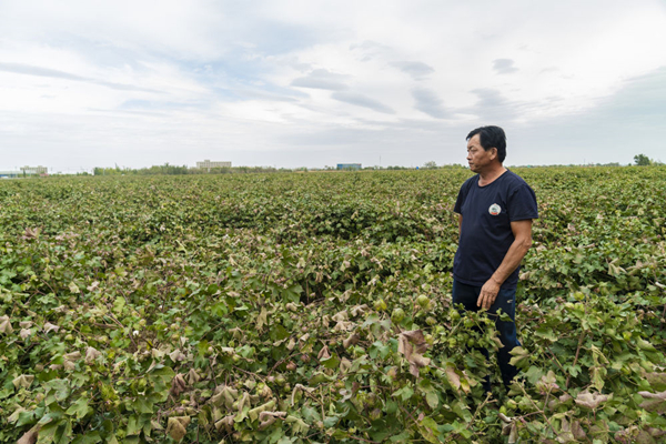 9月14日,在新疆乌鲁木齐附近五家渠市的一片棉田,棉农巩伦全查看棉花长势。新华社记者周生斌摄