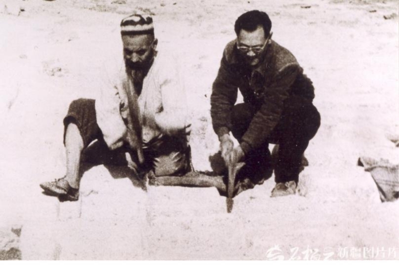 彭加木(右)采集土壤样本。图/中国科学院新疆分院提供