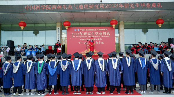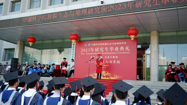 典礼上,新疆分院院长肖文交院士领颂毕业誓词。青年导师代表李小双研究员、优秀毕业生代表李江月、留学生代表凯云以及在校生代表徐仁分别发表了精彩的演讲。他们分享了自己的学术心得、成长经历以及对未来的展望。导师们为学生拨穗、颁发证书。