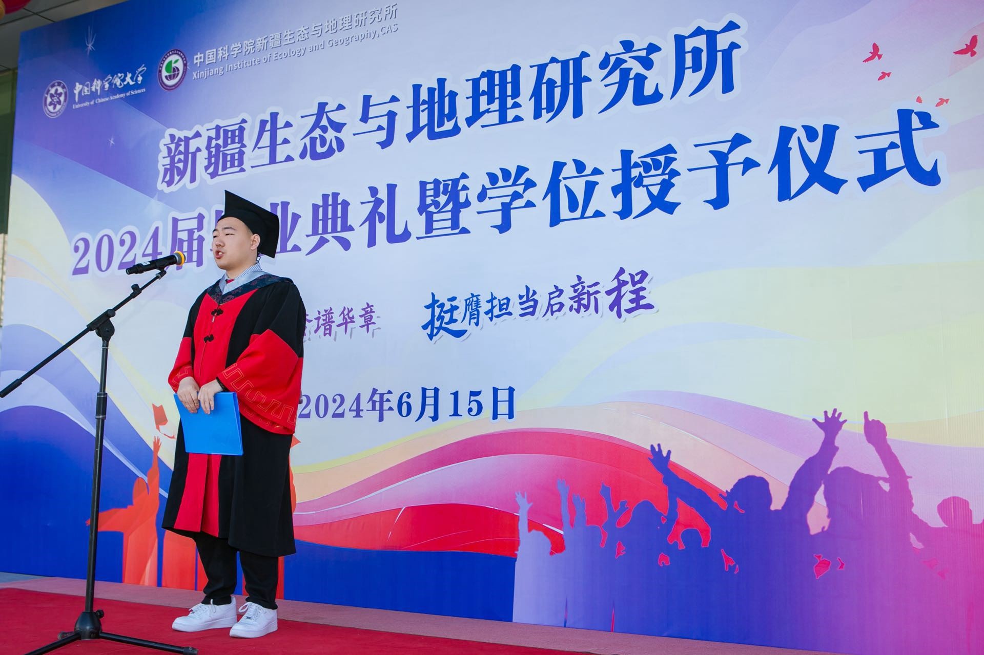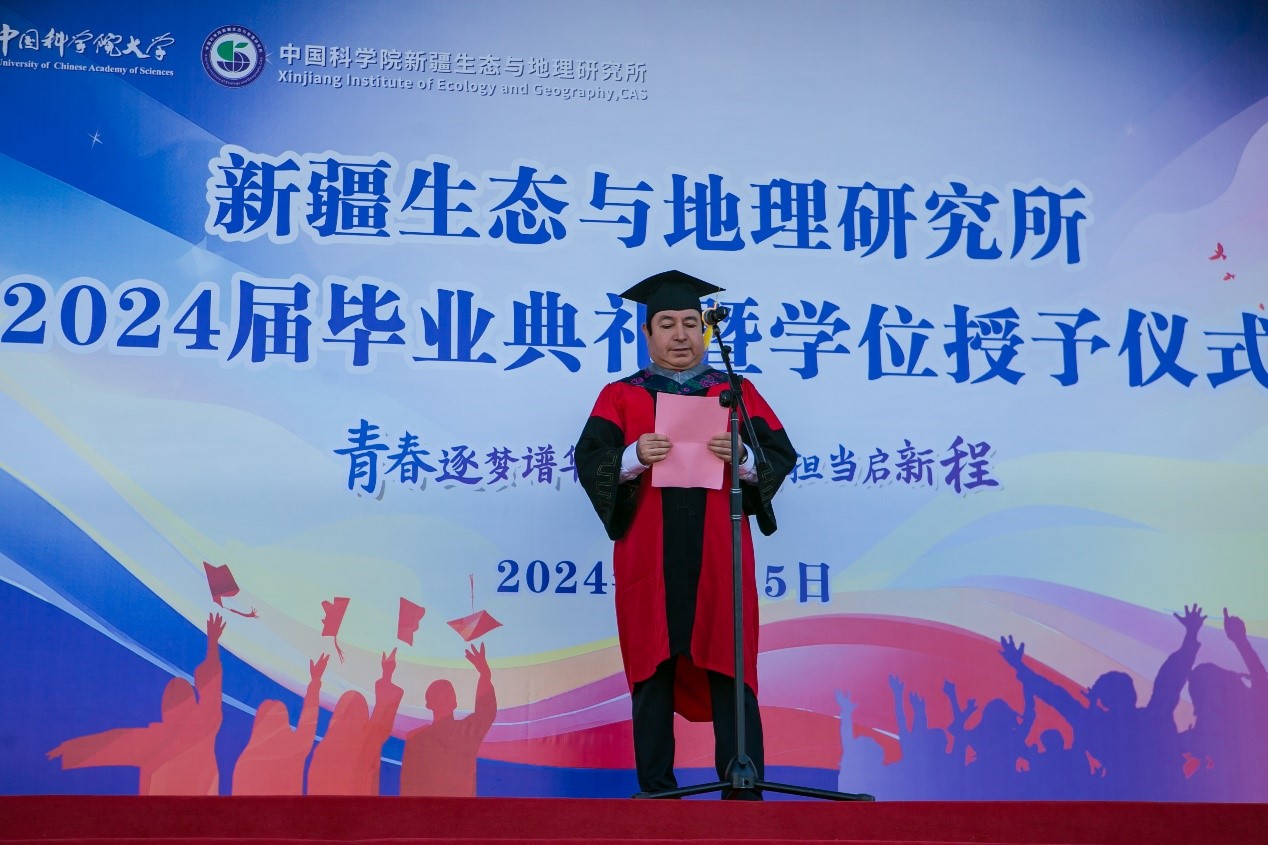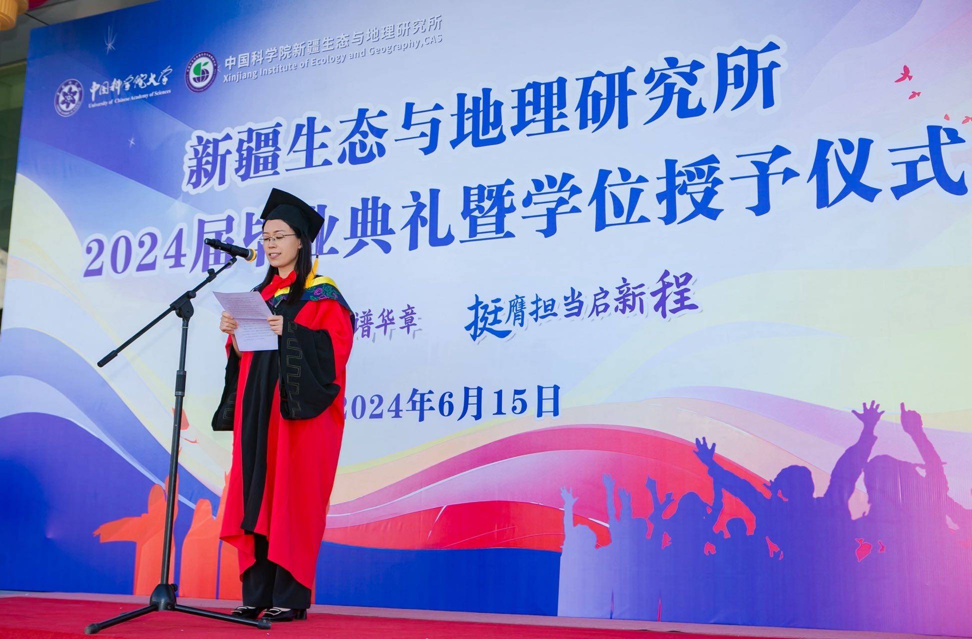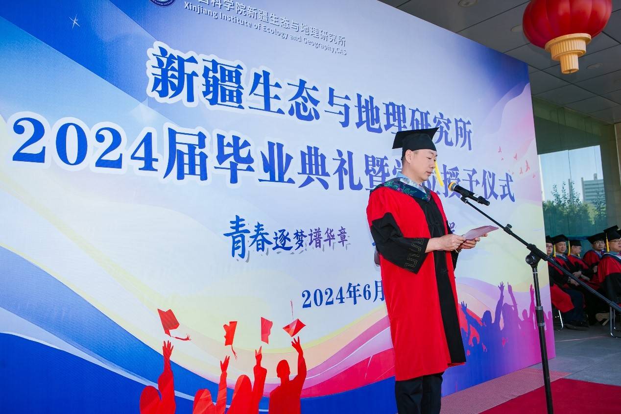 乐发Ⅱ2党委副书记、纪委书记吉力力·阿不都外力宣读2024年博、硕士毕业生名单,祝贺99名毕业生圆满完成学业,开启人生新征程。乐发Ⅱ2所长张元明向全体毕业生致辞,祝贺毕业生顺利完成学业,寄语他们勇担时代重任,在抢占干旱区科技制高点过程中大有所为,始终保持勇于探索的精神,为国家和社会的发展贡献力量。乐发Ⅱ2党委书记、副所长张向军带领全体毕业生宣读毕业誓词,“铭记教师的教诲,履行时代赋予的使命,崇尚科学,追求真理……”,铮铮誓言充分彰显了毕业生们在今后人生道路上将带着研究所的教诲奔赴新的征程。