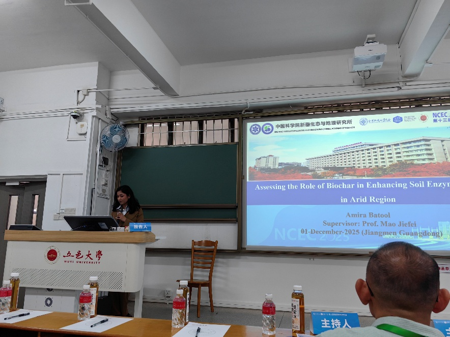 2023级巴基斯坦籍硕士研究生AMIRA BATOOL在研究生专场作题为《Assessing the role of biochar in enhancing soil enzyme activity in arid region》的报告。该研究采用土壤室内孵育实验方法,验证了生物炭显著降低土壤盐分、提升有机碳含量和酶活性,揭示了施用率和热解温度对改良效果的调控作用,为干旱区盐碱土壤修复与农业可持续发展提供了经济可行的技术方案。AMIRA同学的报告从303个研究生口头报告中脱颖而出,获得了大会优秀口头报告奖。
