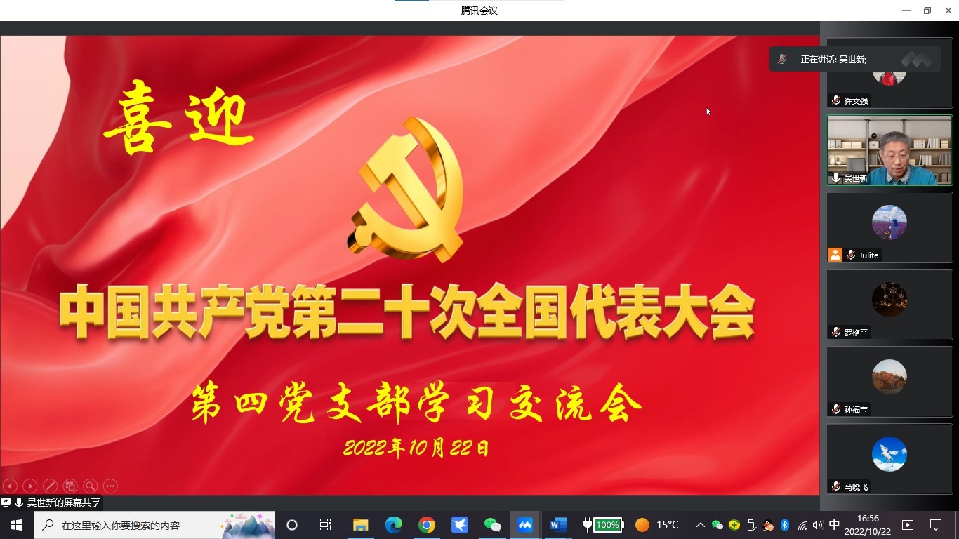 10月22日在党的“二十大”胜利闭幕之际,支部通过视频会形式组织全体党员开展了“喜迎二十大,牢记使命、守正创新、踔厉奋发”主题党日活动。研究所副所长孙福宝以普通党员身份参加活动。全体党员认真学习了习近平总书记在党的“二十大”开幕会上所作的报告,重温了报告中的习语金句、关键词,结合岗位工作实际和这十年来生活变化交流心得体会。