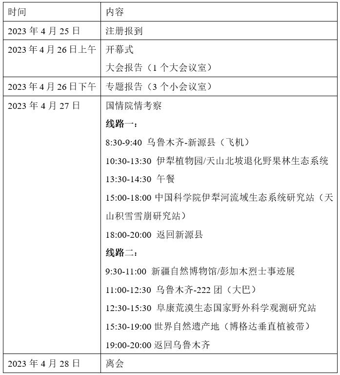 (1)线路一:伊犁植物园/天山北坡野果林退化生态系统、中国科学院伊犁河流域生态系统研究站(天山积雪雪崩研究站)。参加此次考察的同仁建议乘坐4月27日海航旗下天津航空GS7527(北京时间07:50-9:00),须提前自行预订;酒店由活动组织者统一安排,费用自理。