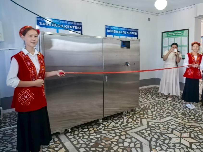 经过ANSO绿色咸海项目办的实地考察和采样评估,位于钦姆拜区和科格利区的三所学校被选为安装净水设备的项目实施点。该设备由中科第三极安徽技术研究院设计制造,采用了中国先进的反渗透和过滤技术,能够有效去除水中的盐分、杂质及有害物质,将原本无法直接饮用的咸水转化为清洁安全的饮用水。设备安装后,学校饮水条件得到根本改善,三所学校的师生喝上了放心水。钦姆拜区区长Tajetdinov Aybek先生指出,净水设备解决了学校健康饮水的基本问题,不仅钦姆拜区第31小学校的师生喝上了甘甜的饮用水,附近100多户村民也来学校打水喝。
