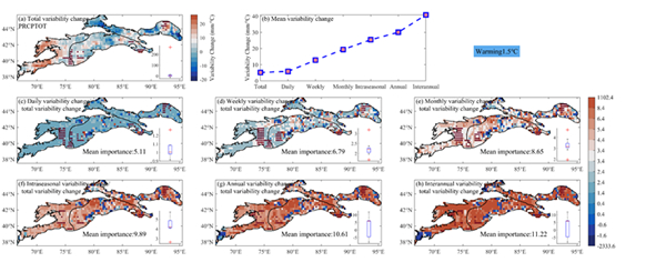 研究结果显示:相较平均态降水,中亚天山地区的极端降水波动性更大,且变率随着时间尺度的延长而增大。升高的温度、增加的大气可降水量,以及土壤水分和饱和水汽压差之间的动态变化较好的解释了极端降水变率变化的背后原因。空间上,天山东部地区(80 E~95 E)的极端降水变率普遍强于西部地区(66 E~80 E)。季节上亦呈现明显差异,一般而言,湿季的变率强于干季。预计未来伴随全球变暖(温度升高1.5,2.0,3.0和4.0 C),极端降水变率(绝对值)整体呈增加趋势,对温度的敏感性将随时间尺度的延长而增大。