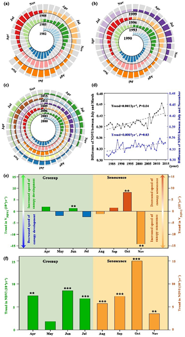 图1. 天然植被VNDVI趋势的年际变化特征. (a)、(b)、(c)分别代表1982-1989、1990-1999、2000-2015年三个时间段内北半球中高纬度地区天然植被的NDVI平均值。(d)中的黑线和蓝线分别代表了1982-2015年的NDVI平均值的差值(7月和3月、7月和11月)。(e)和(f)分别代表了1982-2015年生长季内(4月-11月)VNDVI和NDVI趋势变化。