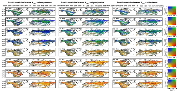 图2. VNDVI和季前气候因子的空间相关性特征. 右侧图例中,纵轴代表了1982-2015年植被VNDVI变化,横轴则代表了植被VNDVI和气候因子的相关性。其中,绿色(VNDVI>0,R>0)代表季前气候因子变量的增加,促使植被返青期内的生长速率加快。蓝色(VNDVI>0,R<0)代表季前气候因子变量的增加,导致植被返青期内的生长速率减缓。黄色(VNDVI<0,R<0)和红色(VNDVI<0,R>0)分别代表了季前气候因子变量的增加导致了植被在衰亡期内衰亡速率加快和减慢。图中的黑色点区域代表了显著相关(p<0.05)。