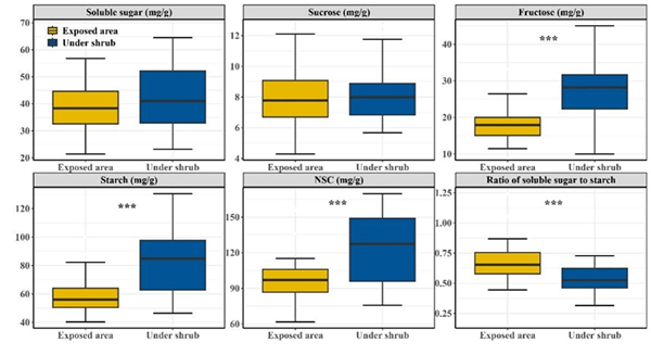 研究表明,齿肋赤藓总NSC及其各组分含量受灌丛效应、年降水和年均温的共同影响。灌丛的存在显著提高了齿肋赤藓果糖、淀粉和总NSC含量,降低了可溶性糖/淀粉。随着年均降水量的减少,齿肋赤藓总NSC、各组分含量以及可溶性糖/淀粉显著增加,两种微生境间(灌丛下和裸露地)的差异随着年均降水量的增加逐渐缩小,表明微生境的影响总体受气候(降水)变化的调控;而随着年均温的增加,两种微生境则表现出相反的结果。结构方程模型分析结果显示,气候和灌丛直接通过改善土壤养分间接影响了齿肋赤藓NSC含量。其中,灌丛的影响最为显著,其次是年均降水量,且随着年均降水量的减少灌丛效应逐渐增加。上述研究结果为理解不同微生境藓类植物抗逆性机制提供了新的见解。