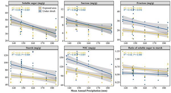 受干旱和半干旱地区水分的限制,生物土壤结皮与维管植物镶嵌分布格局成为干旱荒漠区重要植被景观。研究表明,微生境的改变,如荒漠灌丛的“肥岛”和“湿岛”效应等,为生物土壤结皮中藓类植物的生长和发育创造了良好的生存空间。非结构性碳水化合物(NSC:包括可溶性糖和淀粉)是植物光合作用和生长发育重要的中间产物,其含量反映了环境变化下植物碳源和碳汇之间的平衡状态。然而,在大空间尺度降水梯度发生变化的情景下,灌丛效应又将如何影响荒漠藓类植物的非结构性碳水化合物含量及组分分配,这种影响是否受到气候环境的调控还缺乏定量研究。对上述问题的深入研究有助于更好的理解藓类植物的碳平衡及其生态适应策略。