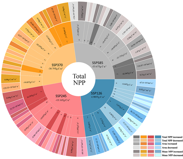 图2. 2020-2100 年期间全球陆地植被总NPP、各类潜在自然植被的总NPP、平均NPP和面积在SSP1-2.6、SSP2-4.5、SSP3-7.0 和 SSP5-8.5 情景下的年变化率(2020-2100年)。(a)冻原与高山草甸,(b)冷荒漠,(c)半荒漠,(d)草原,(e)温带湿润草原,(f)温带森林,(g)亚热带森林,(h)热带森林,(i)暖荒漠,(j)稀树草原
