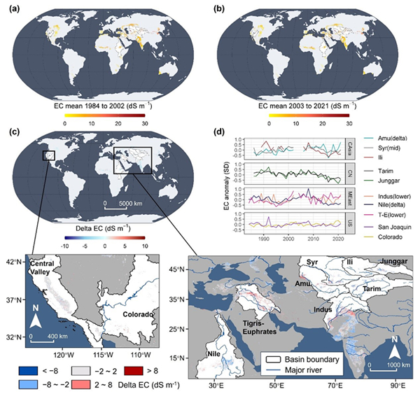 在干旱区,不合理的灌溉和水管理可能引起耕地的土壤盐渍化。因此,通过优化水管理方式来减轻土壤盐渍化对实现土地退化中和等可持续发展目标十分重要。然而,由于方法学局限,耕地土壤盐渍化与水管理的大尺度信息严重匮乏,限制了我们理解水管理方式对盐渍化的影响及其驱动机制。
