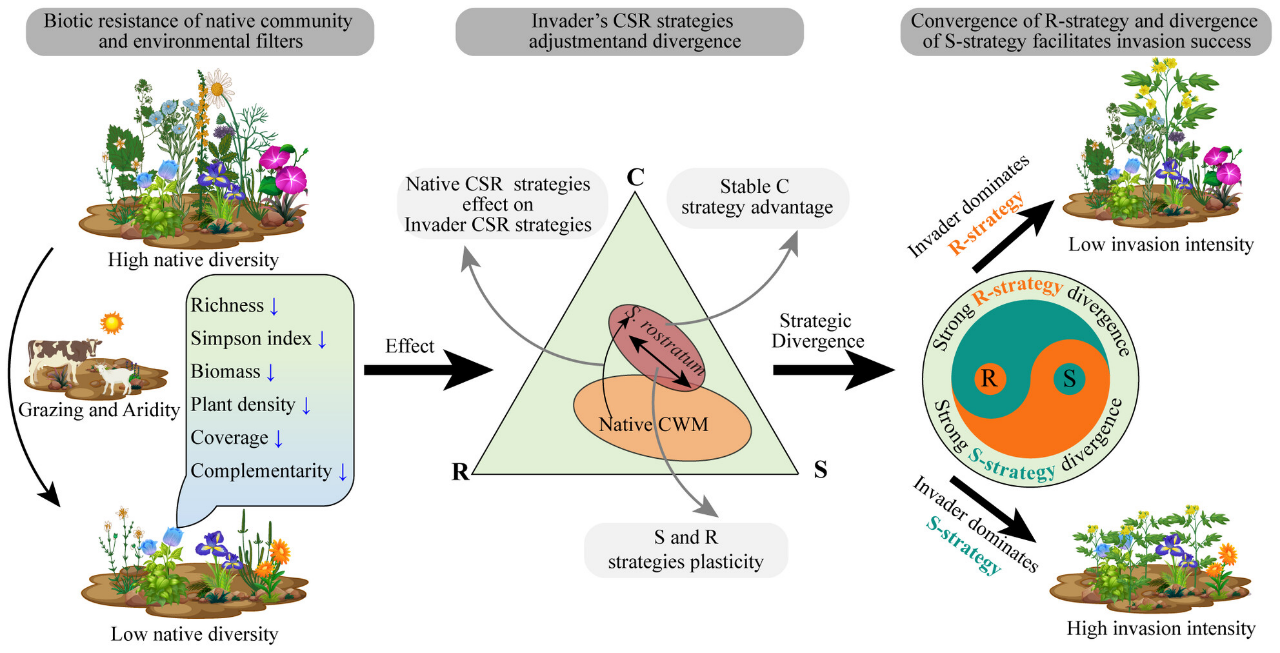 图2:机制图展示了沿入侵梯度,黄花刺茄(Solanum rostratum)在耐胁迫(S)策略和先锋者(R)策略之间转变。这些转变受到原生群落特性和放牧压力的影响,这些因素共同推动了与本地物种的策略分化,并最终促进了其在异质环境中的入侵成功