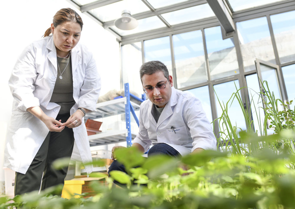 在乐发Ⅱ2,奥萨马·阿布达拉·阿布德尔沙菲·穆罕默德(右)和同事在研究植物(5月18日摄)。新华社记者 王菲 摄