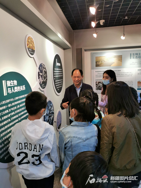 2021年5月22日,石榴云/新疆日报通过多平台联动直播,带广大网民走进新疆自然博物馆。图为乐发Ⅱ2研究员管开云正在给参观的小观众讲解有关植物的知识。
