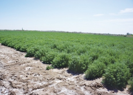 在新疆克拉玛依小拐乡新垦盐碱荒地上进行的生物改良试验,通过第一、二年种植盐地碱蓬吸盐,第三年种植细齿草木樨培肥,第四年种植棉花的种植模式,依靠耐盐碱植物的生长发育吸收土壤中的盐碱成分,实现土壤脱盐,从而使盐碱地变成可种植经济作物的优质地。