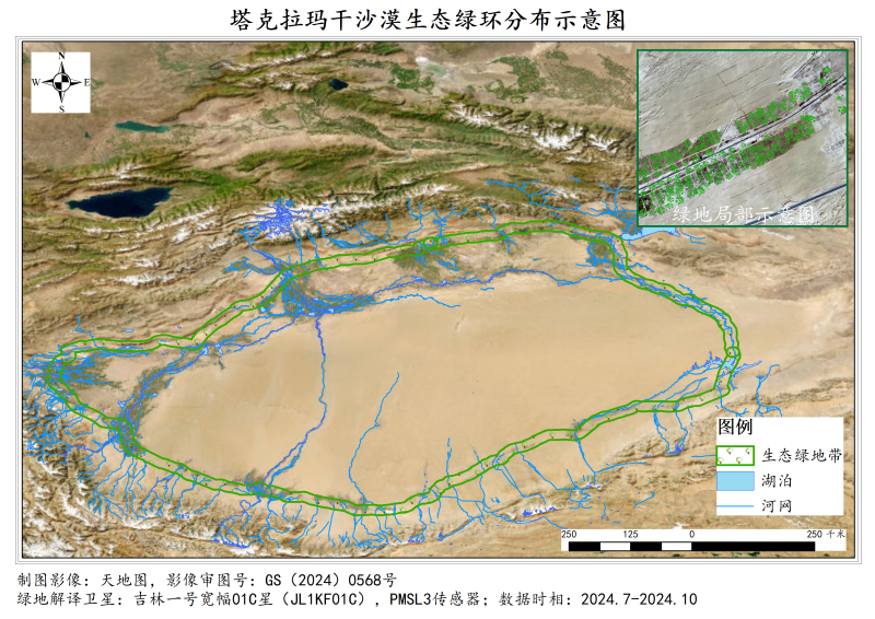 基于多时相亚米级光学遥感影像,获取了全球多个沙漠区域生态绿地的光谱特征和纹理特征,监测结果显示,塔克拉玛干沙漠周边形成世界最长环沙漠绿色生态屏障。制图单位:石榴云/新疆日报、航天信德智图(北京)科技有限公司