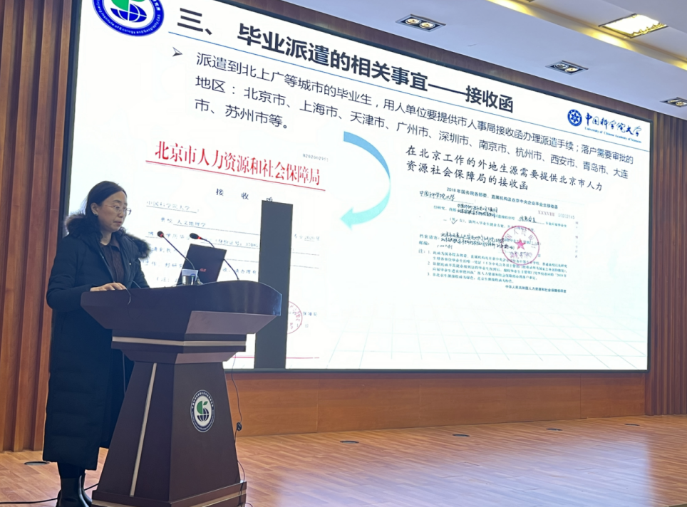 研究生教育处处长周斌就2024年研究生就业形势、就业政策、毕业工作各环节的总体要求及时间安排进行部署。针对正处于就业择业期的毕业生开展专场就业派遣指导,详细介绍了毕业生档案、户口和组织关系转接,毕业和就业派遣手续办理等工作。此外还对研究所博士招生、博士后申请和特别研究助理项目等进行政策解读和全面介绍。