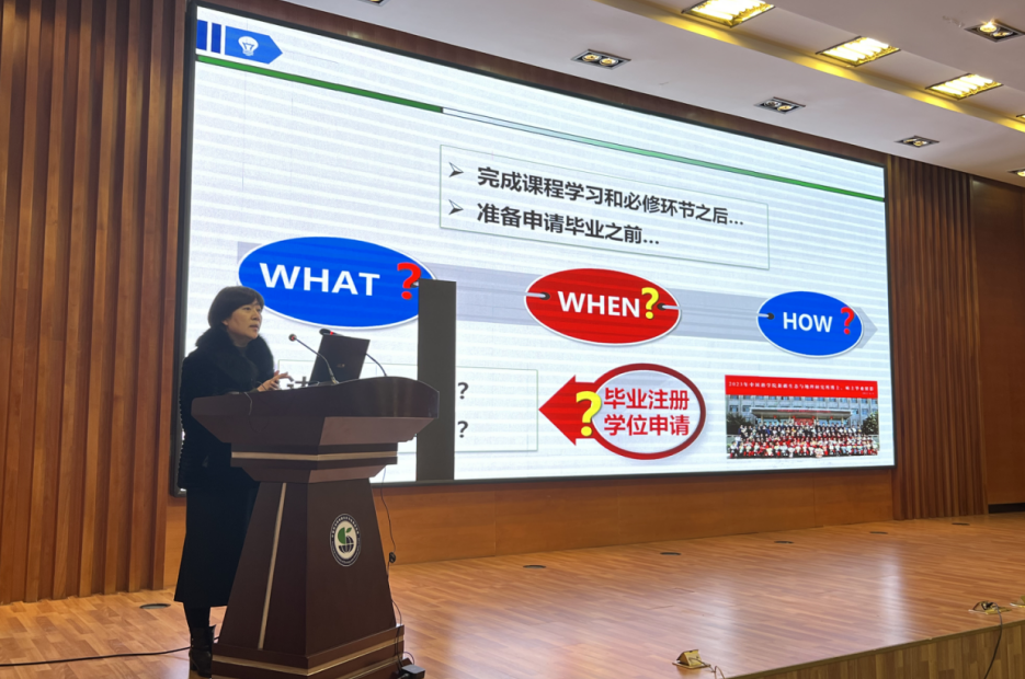 研究生教育处培养工作主管杨玉玲详细介绍了研究生毕业答辩和学位申请注意事项,围绕课程学分、科研成果、论文送审和学位答辩安排等方面对学生进行指导。