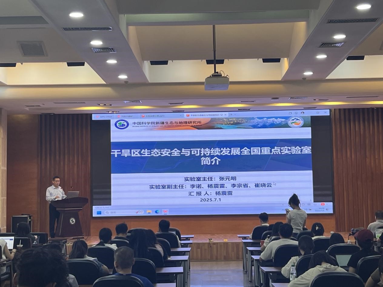学术报告环节精彩纷呈,多位研究员带来前沿领域的专题报告。杨震雷研究员系统阐述了干旱区生态安全与可持续发展全国重点实验室的研究方向;马龙研究员重点展示了丝路绿色发展研究中心在生态监测、水资源评估等领域的国际合作成果;李稚研究员深入分析了中亚地区水循环要素演变规律;李小双研究员分享了极端环境生物适应性研究的最新进展;李诺研究员介绍并展示了研究所在新疆矿产资源研究中的丰硕成果;李生宇正高级工程师则展示了研究所在沙漠治理领域的科技创新成果;雷军研究员系统介绍了新疆旅游研究院在旅游规划、生态旅游等领域的科研成果;闻志彬副研究员分享了科研工作经验,指出科研须立足事实与学科规律,鼓励学生在热爱中追求目标、于挑战中成长。这一系列高水平的学术报告不仅展现了研究所的综合科研实力,也为新生未来的研究方向提供了重要参考。