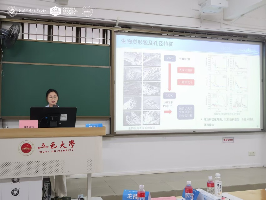 2023级硕士研究生范莉莉在“生物炭环境化学与绿色工程实践”分会场作题为《钠离子在生物炭表面的吸附作用》的报告。该研究采用了生物炭热解与吸附实验相结合的方法,揭示了不同原料和温度制备的生物炭对钠离子吸附效能的显著差异,阐明了生物炭比表面积和初始钠含量对吸附性能的影响规律,为干旱区盐碱土改良中生物炭的物料筛选与制备工艺优化提供了科学依据。